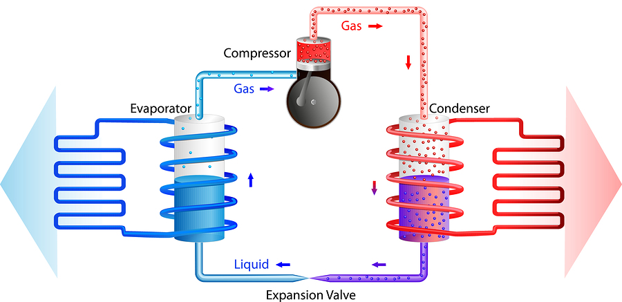 A heat pump transfers heat by circulating refrigerant between two heat exchange coils. In one coil, called the “evaporator”, liquid refrigerant evaporates to a vapour at low pressure and in doing so, absorbs heat from its surroundings (the heat source). An electrically driven compressor then pumps this gaseous refrigerant to the other “condenser” coil under high pressure, where the refrigerant condenses back to a liquid and releases the heat energy it absorbed earlier in the cycle to the heat sink. An expansion device then lowers the refrigerant pressure and the cycle is repeated.