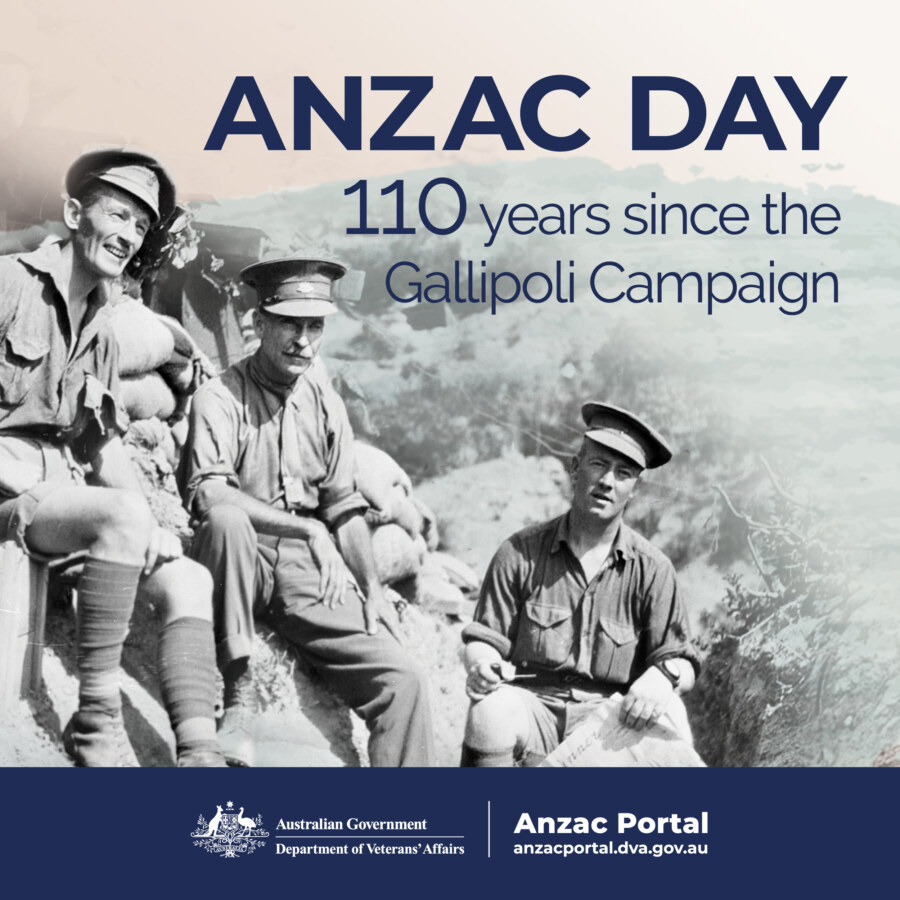 The image pictured, commemorates 110 years since the Gallipoli Campaign involving the Australian and New Zealand Army Corps and the Royal Australian Navy. Major Ernest Morgan Williams, Brigadier General Henry George Chauvel and Captain Walter Percy Farr sitting in front of Courtney’s Post.