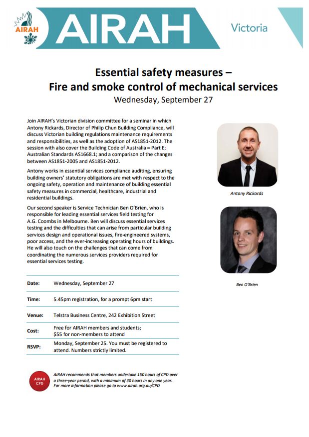 AIRAH’s Victorian Division is hosting a seminar on ‘Essential Safety Measures – Fire and Smoke Control’ at the Telstra Business Centre, 242 Exhibition Street, on Wednesday the 27th September.