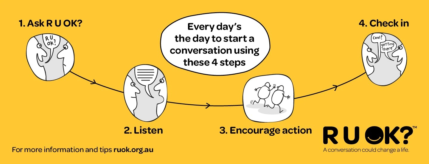 To find out more on what to say after R U OK? Or to download the FREE resources for tips and ideas to help you share the message in your community visit: https://www.ruok.org.au/join-r-u-ok-day